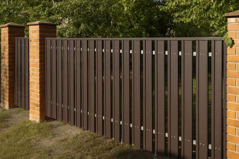 Забор из металлического штакетника — это надежное и эстетичное ограждение, подходящее как для частных домов, так и для промышленных объектов. Конструкция представляет собой набор вертикальных металлических ламелей, закрепленных на поперечные лаги, установленные на столбы.